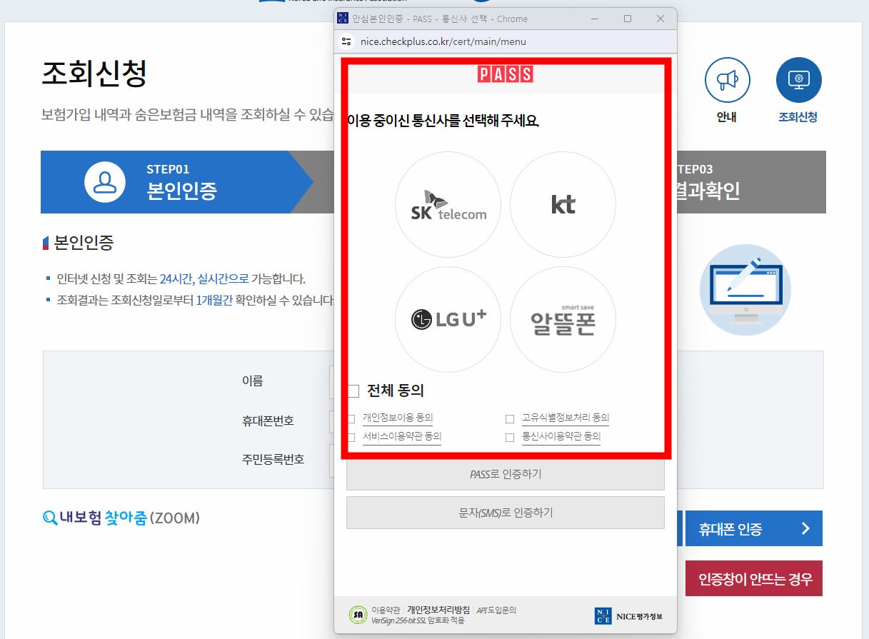 공동인증서, 아이핀, 휴대폰 인증 중 하나를 선택하여 본인인증을 완료하면 개인별 맞춤 보험 정보를 확인할 수 있습니다.