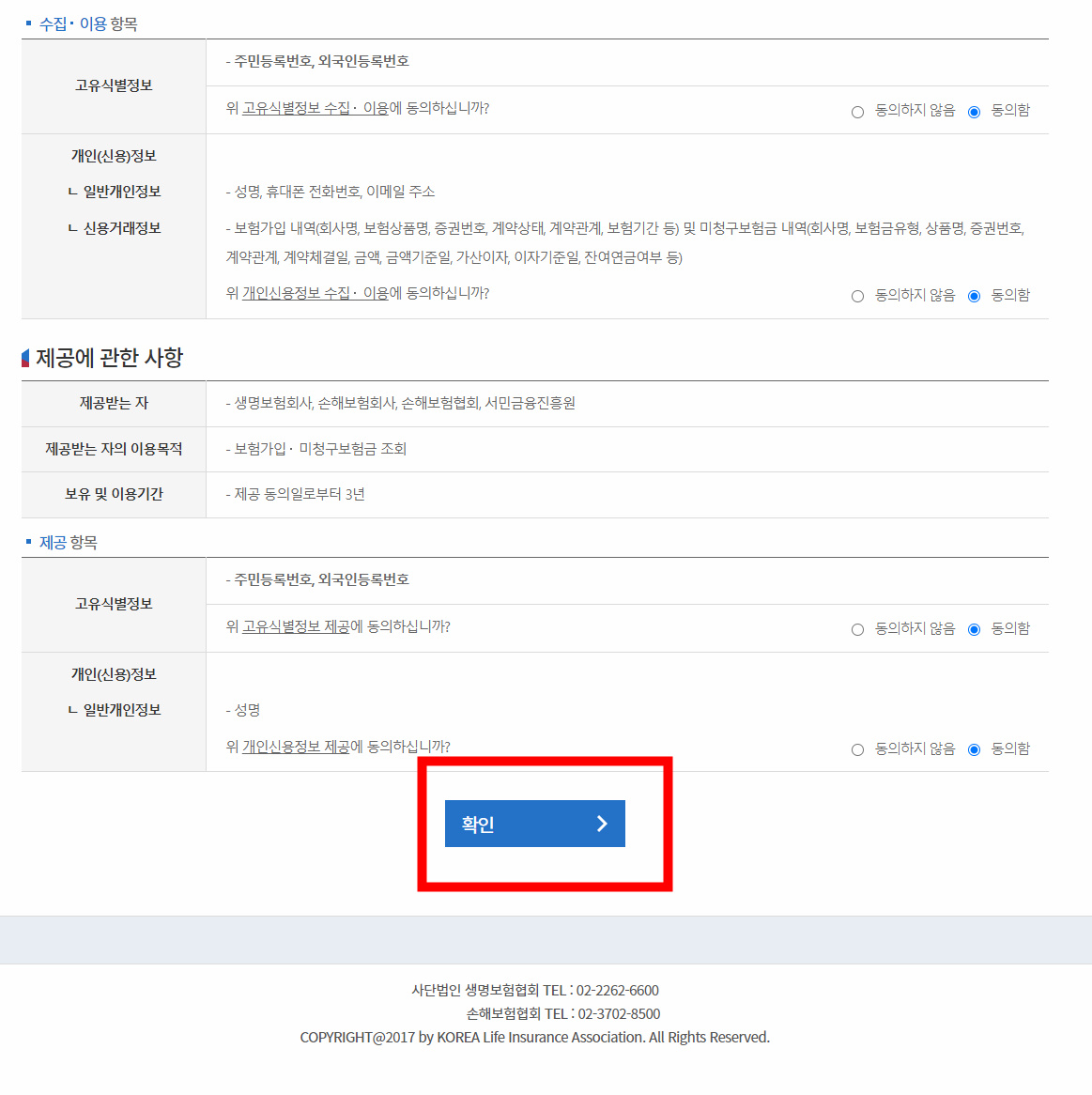 모두 다 동의를 한 후에 확인을 클릭하 빈다.